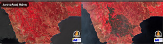 Στις εικόνες που δημοσίευσε το Meteo από τον Ευρωπαϊκό δορυφόρο Sentinel-2 αποκαλύπτεται το μέγεθος των καμένων εκτάσεων.