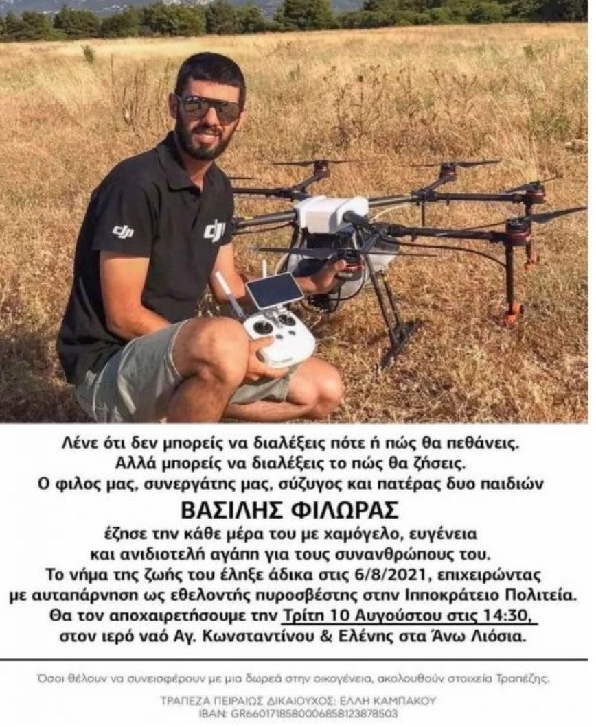 Ο εθελοντής πυροσβέστης, που ήταν πατέρας δύο παιδιών, άφησε την τελευταία του πνοή στο ΚΑΤ όπου είχε μεταφερθεί σε εξαιρετικά κρίσιμη κατάσταση. Ο Βασίλης Φιλώρας έφτιαχνε drones για τον ελληνικό στρατό, την ΕΡΤ και την Πολιτική Προστασία.