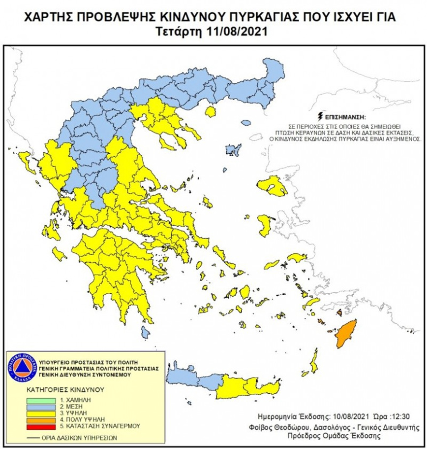 Σύμφωνα με το Χάρτη Πρόβλεψης Κινδύνου Πυρκαγιάς που εκδίδει η Γενική Γραμματεία Πολιτικής Προστασίας του Υπουργείου Προστασίας του Πολίτη (civilprotection.gr), για αύριο Τετάρτη 11 Αυγούστου 2021, προβλέπεται πολύ υψηλός κίνδυνος πυρκαγιάς (κατηγορία κινδύνου 4) για τις εξής περιοχές: