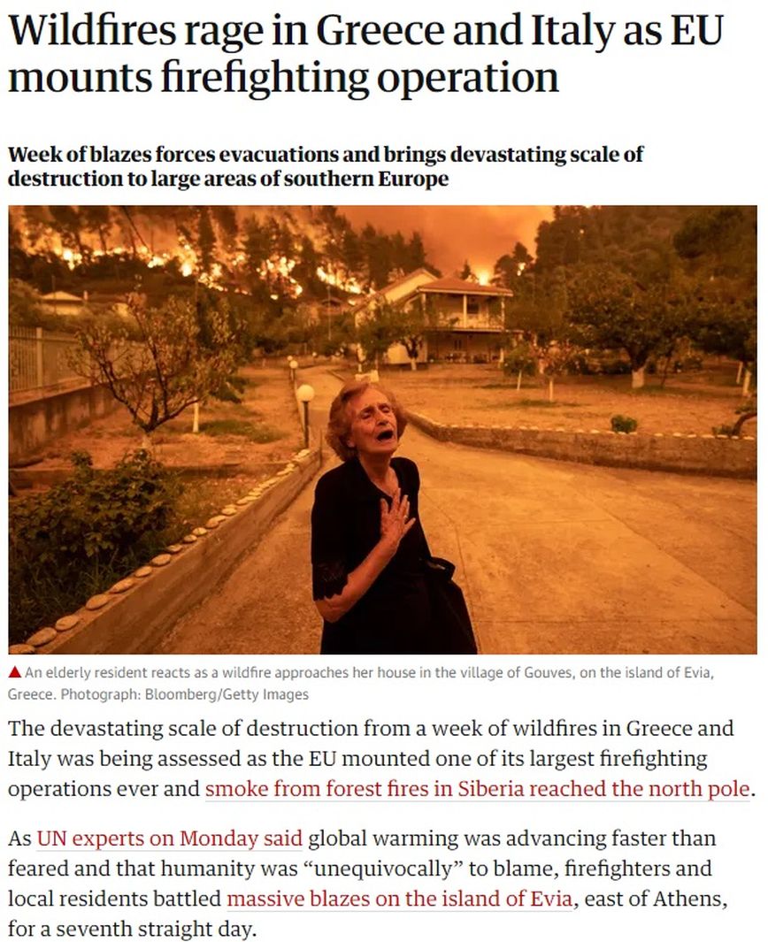 Μία φωτογραφία από τις πυρκαγιές που έκαψαν την Εύβοια προκάλεσε ρίγη συγκίνησης και ταξίδεψε εκτός συνόρων. Η κ. Παναγιώτα έγινε πρωτοσέλιδο στον ξένο Τύπο. Με μια κίνηση του χεριού της, με τα μάτια κλειστά και το στόμα ανοιχτό, δείχνει την απόγνωσή της τη στιγμή που πρέπει να εγκαταλείψει το σπίτι της στις Γούβες.