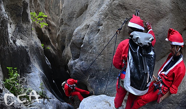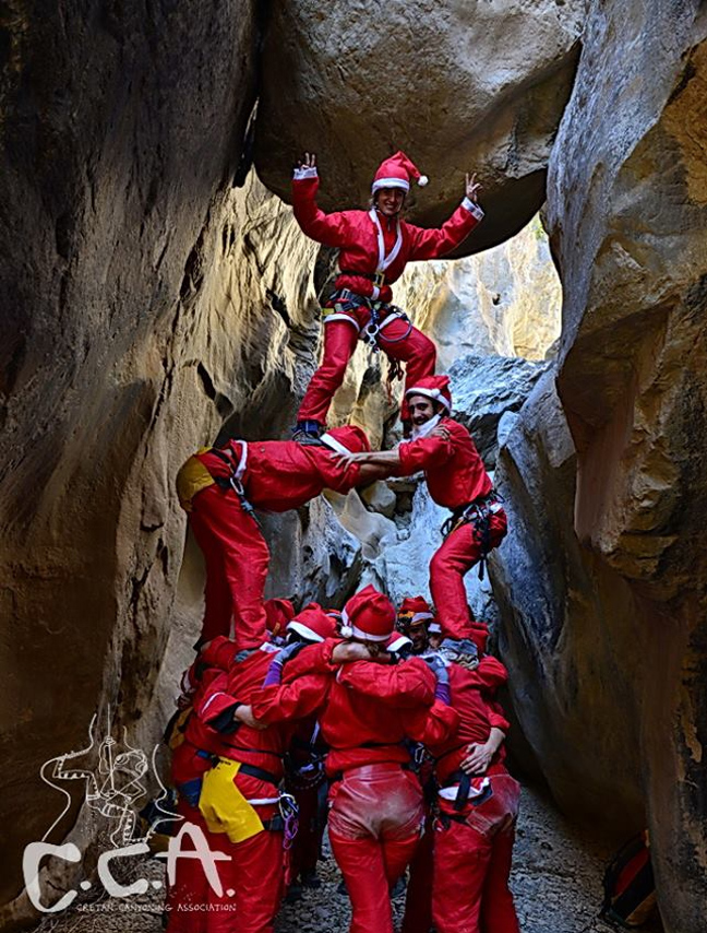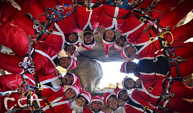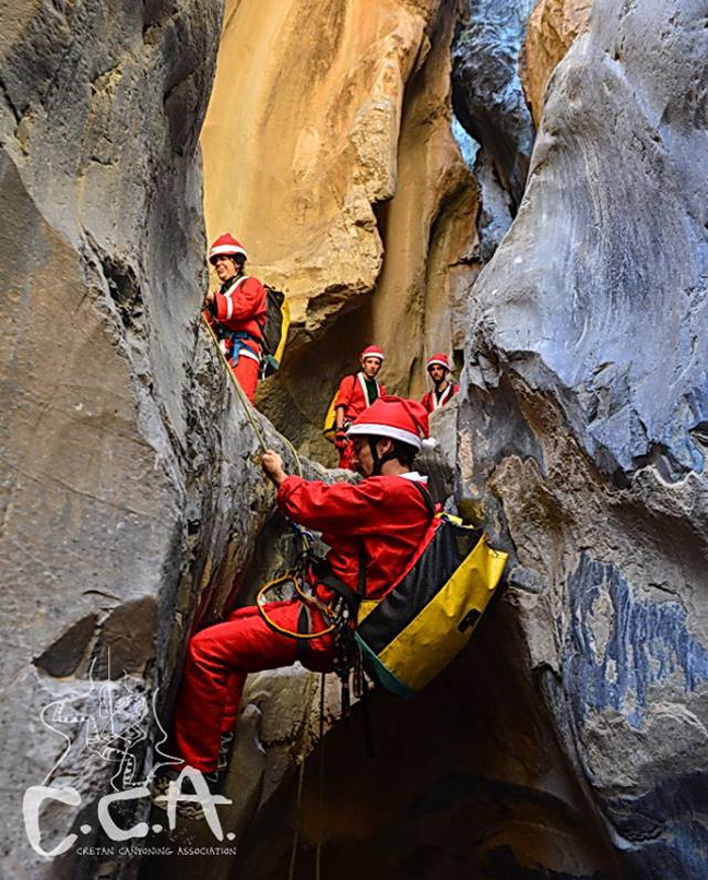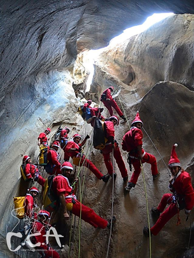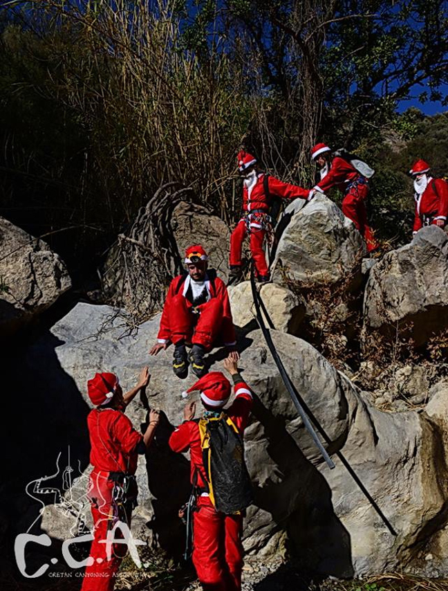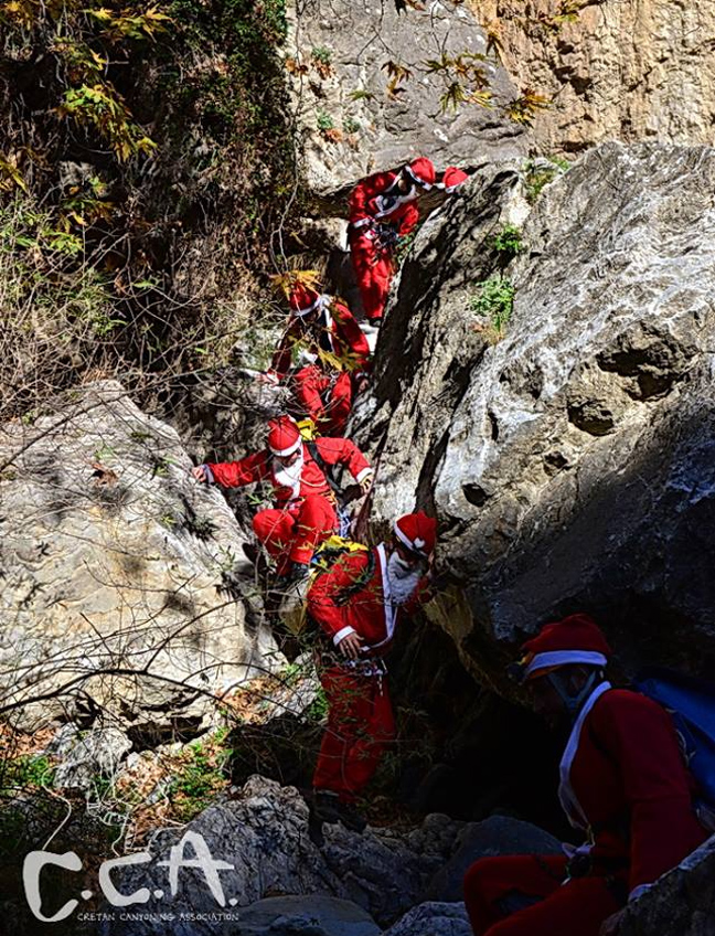 Ντύθηκαν στα χρώματα του Αϊ Βασίλη και με γιορτινή διάθεση πραγματοποίησαν τεχνική κατάβαση φαραγγιού. Ο λόγος για 20 μέλη του Παγκρήτιου Ομίλου Διάσχισης & Εξερεύνησης Φαραγγιών (Π.Ο.Ε.Φ.- www.canyon.gr) που διοργάνωσε την Κυριακή Χριστουγεννιάτικη επετειακή κατάβαση στο άβατο φαράγγι του Έλιγκα στην περιοχή της Εμπάρου.