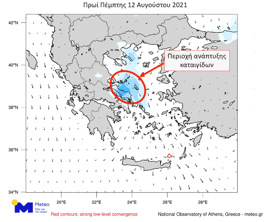 Ο χάρτης του ΕΕΑ / meteo, παρακάτω, δείχνει με γαλάζιο χρώμα τις περιοχές με ευνοϊκές συνθήκες για την ανάπτυξη καταιγίδων το πρωί της Πέμπτης 12/08: