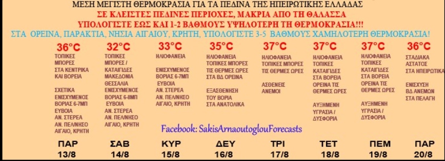 Ο Σάκης Αρναούτογλου σημειώνει πως σε κλειστές πεδινές περιοχές, μακριά από τη θάλασσα η θερμοκρασία θα είναι 1-2 βαθμούς υψηλότερη, ενώ σε ορεινά και παράκτιες περιοχές το θερμόμετρο θα δείχνει από 3 έως και 5 βαθμούς χαμηλότερα.