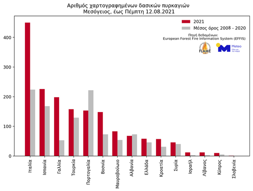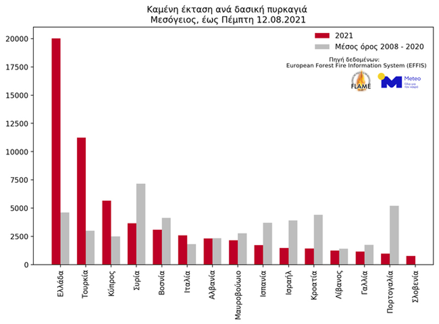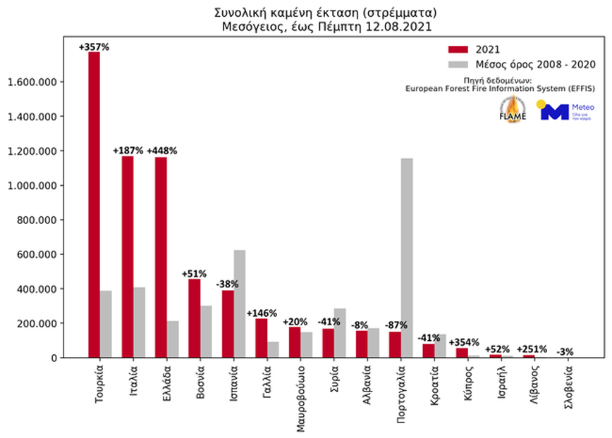 Χρησιμοποιώντας τα δεδομένα αυτά προκύπτει ότι η μέση καμένη έκταση ανά δασική πυρκαγιά στην Ελλάδα ανέρχεται σε περίπου 20.000 στρέμματα για το 2021 (έως και 13.08.2021), γεγονός που κατατάσσει τη χώρα μας πρώτη στη Μεσόγειο, με πολύ σημαντική διαφορά ακόμα και από τη δεύτερη Τουρκία (εικόνα 3)
