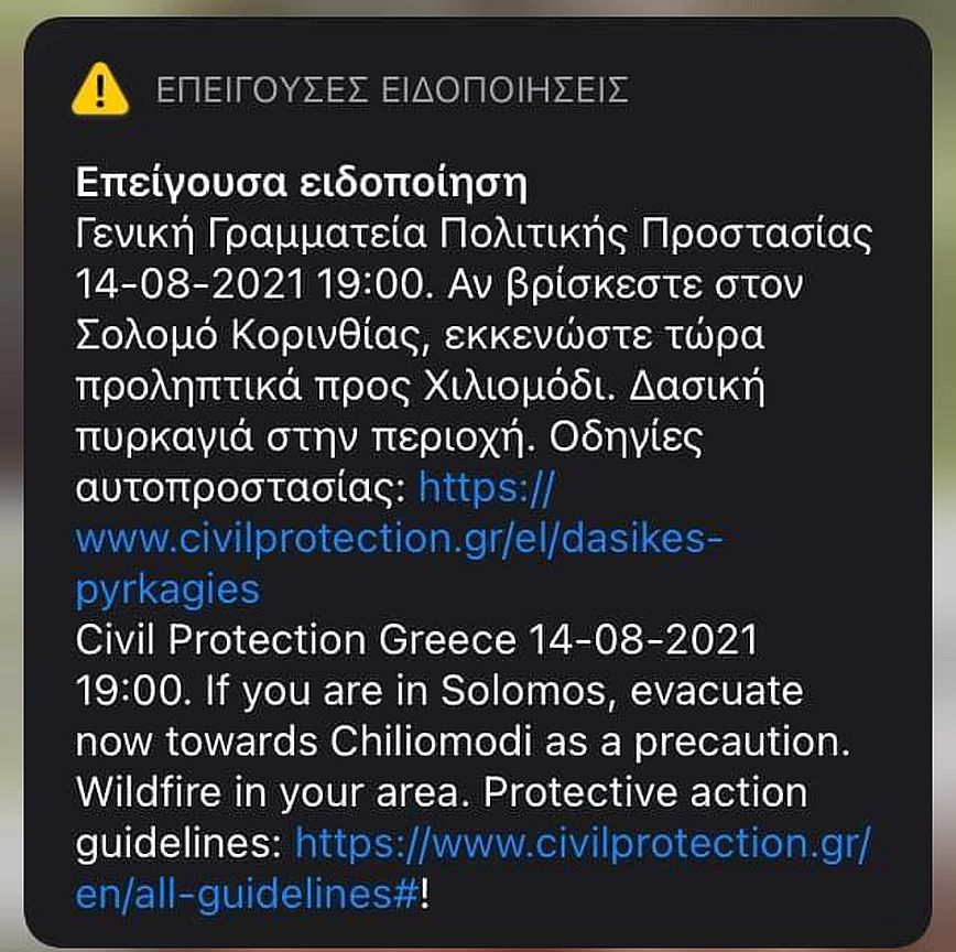 Μήνυμα του 112 για προληπτική εκκένωση του οικισμού Σολομός στην Κορινθία εστάλη στις 19:00 λόγω φωτιάς.