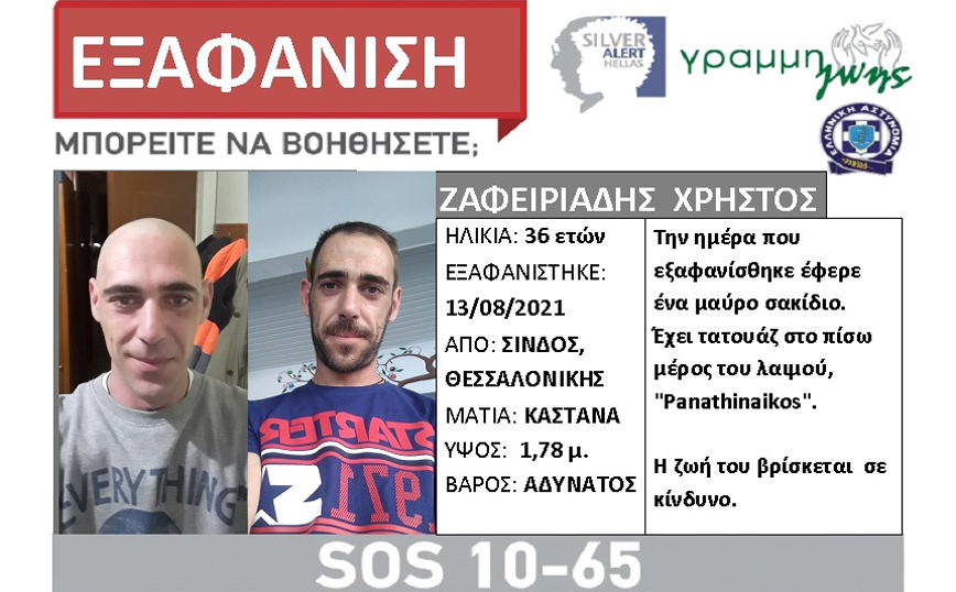 Πρόκειται για τον Χρήστο Ζαφειριάδη, τα ίχνη του οποίου χάθηκαν στις 13 Αυγούστου. Έχει καστανά μάτια, ύψος 1,78μ και είναι αδύνατος. Την ημέρα που εξαφανίστηκε, είχε μαζί του ένα μαύρο σακίδιο. Έχει τατουάζ στο πίσω μέρος του λαιμού, που γράφει «Panathinaikos».