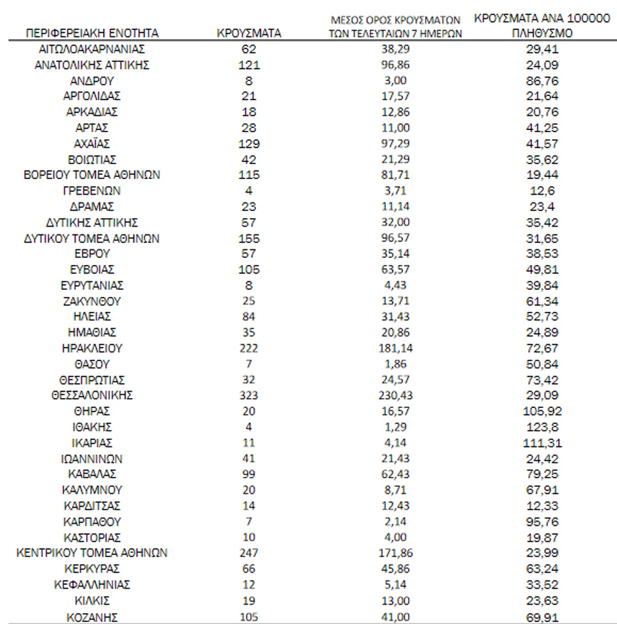 Συγκεκριμένα η Αττική έχει 969 κρούσματα κορονοϊού, η Κρήτη 470, η Ρόδος 150 και η Θεσσαλονίκη 323.