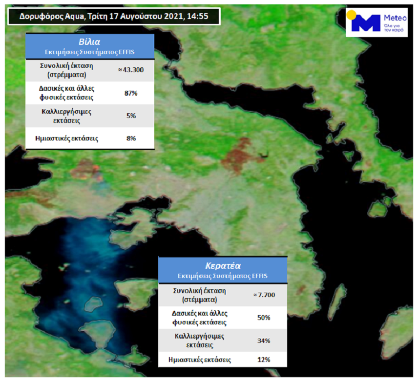 Σε περίπου 50.000 στρέμματα υπολογίζονται από τo Πληροφοριακό Σύστημα για τις Δασικές Πυρκαγιές στην Ευρώπη (European Forest Fire Information System – EFFIS) οι καμένες εκτάσεις σε Βίλια και Κερατέα έως το μεσημέρι της Τρίτης (17/8), σύμφωνα με άρθρο των κ.κ. Α. Καραγιαννίδη και Κ. Λαγουβάρδου στο meteo.gr.