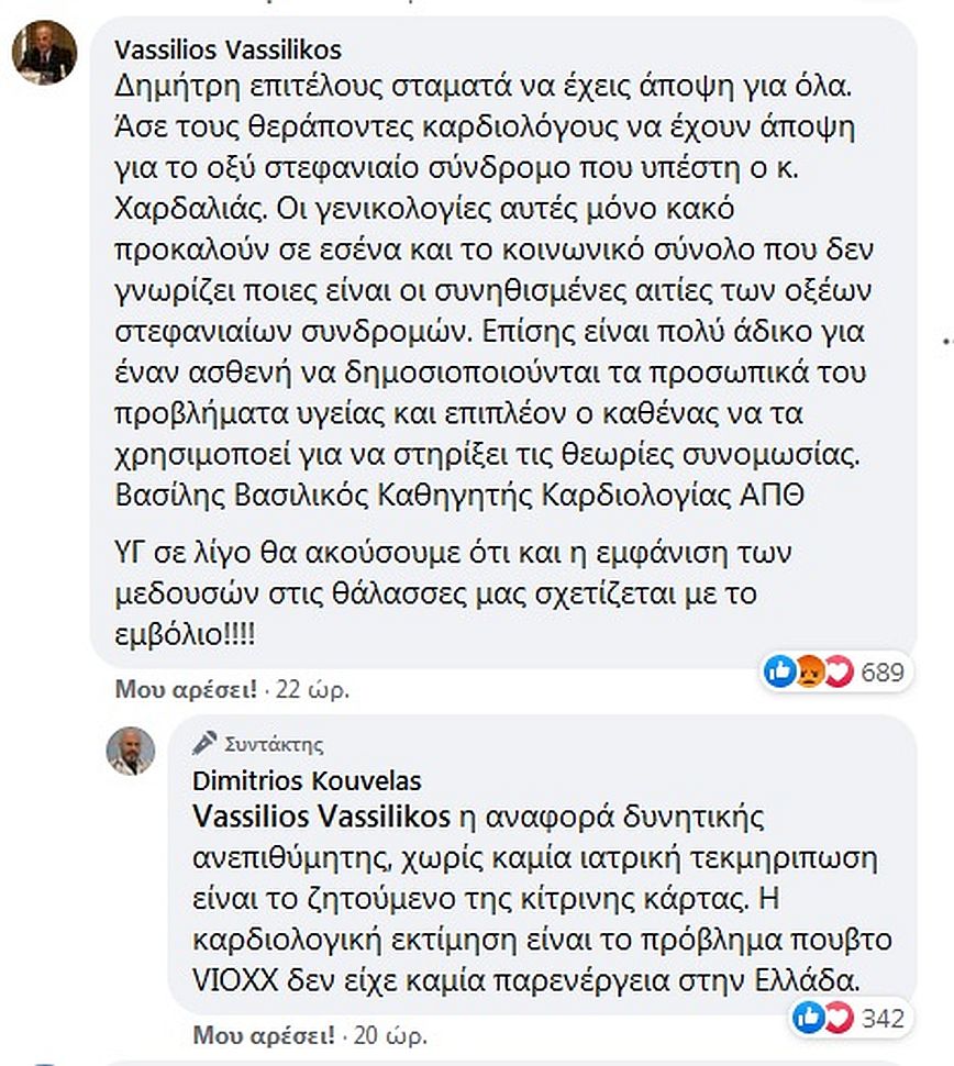 «Δημήτρη επιτέλους σταμάτα να έχεις άποψη για όλα. Άσε τους θεράποντες καρδιολόγους να έχουν άποψη για το οξύ στεφανιαίο σύνδρομο που υπέστη ο κ. Χαρδαλιάς. Οι γενικολογίες αυτές μόνο κακό προκαλούν σε εσένα και το κοινωνικό σύνολο που δεν γνωρίζει ποιες είναι οι συνηθισμένες αιτίες των οξέων στεφανιαίων συνδρομών […] «Σε λίγο θα ακούσουμε ότι και η εμφάνιση των μεδουσών στις θάλασσές μας σχετίζεται με το εμβόλιο» απάντησε.