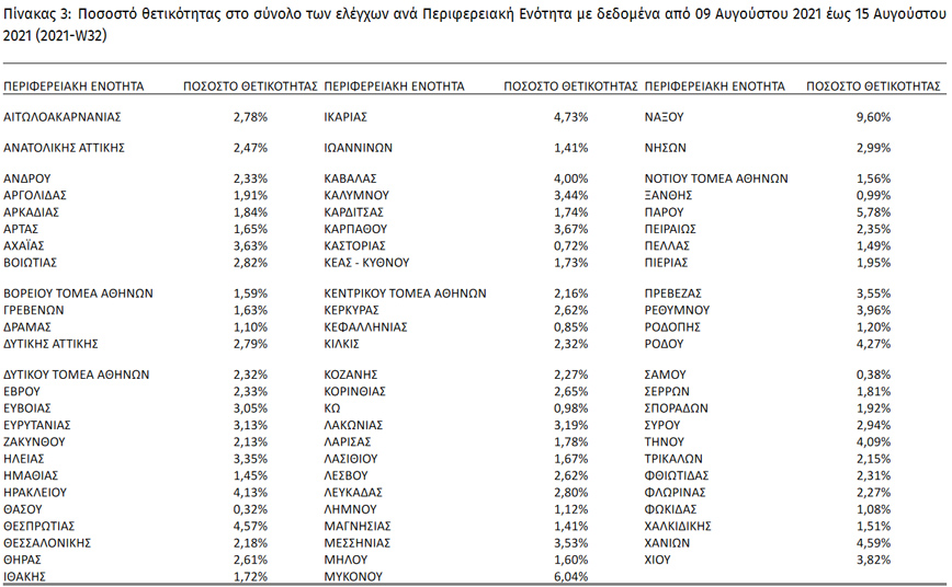 Στον αποψινό, λοιπόν, «πίνακα 3» της ημερήσιας ανακοίνωσης του ΕΟΔΥ («Ποσοστό θετικότητας στο σύνολο των ελέγχων ανά Περιφερειακή Ενότητα με δεδομένα από 09 Αυγούστου 2021 έως 15 Αυγούστου 2021 [2021-W32]) συναντάμε, μεταξύ άλλων, τις παρακάτω τιμές: