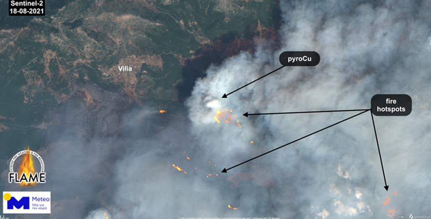 Κατά τη διάρκεια της Τετάρτης 18 Αυγούστου 2021, η επικράτηση ασθενέστερων ανέμων και αστάθειας στην ατμόσφαιρα βοήθησε ώστε η πυρκαγιά να αναπτύξει ισχυρή επαγωγική στήλη (ισχυρά ανοδικά ρεύματα εξαιτίας της πολύ ισχυρής θέρμανσης του αέρα από την καύση της καύσιμης ύλης), οδηγώντας τελικά στην εμφάνιση πυροσωρείτη (Εικόνα 2).