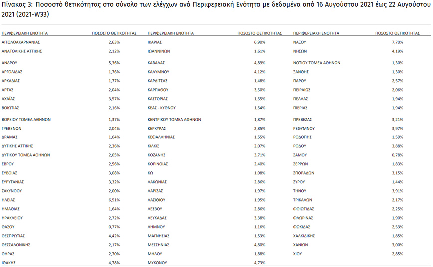 Στον αποψινό, λοιπόν, «πίνακα 3» της ημερήσιας ανακοίνωσης του ΕΟΔΥ («Ποσοστό θετικότητας στο σύνολο των ελέγχων ανά Περιφερειακή Ενότητα με δεδομένα από 16 Αυγούστου 2021 έως 22 Αυγούστου 2021 [2021-W33]») συναντάμε, μεταξύ άλλων, τις παρακάτω τιμές: