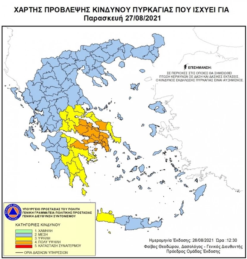Πολύ υψηλός είναι ο κίνδυνος πυρκαγιάς για σήμερα, Παρασκευή 27 Αυγούστου 2021 στις Περιφέρειες Στερεάς Ελλάδας, Αττικής και Πελοποννήσου.