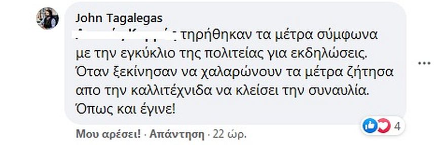 Ανάμεσα στους θεατές ήταν και ο δήμαρχος Γιάννης Ταγκαλέγκας ο οποίος μάλιστα ανέβασε φωτογραφίες και βίντεο στο Facebook. Όπως διευκρίνισε όταν η κατάσταση ξέφυγε ζήτησε από την ερμηνεύτρια να κλείσει τη συναυλία το οποίο, όπως αναφέρει ο ίδιος, έγινε.