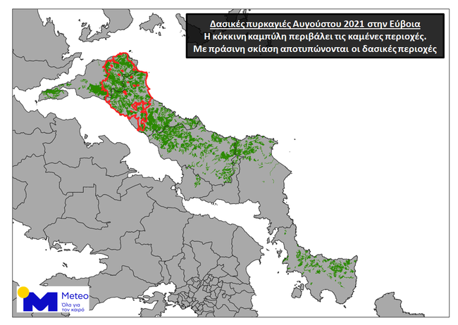 Σύμφωνα με τις πρόσφατες λεπτομερείς δορυφορικές καταγραφές, η πυρκαγιά έκαψε το 33% αυτής της έκτασης, δηλαδή περίπου το ένα τρίτο των δασών της Εύβοιας.
