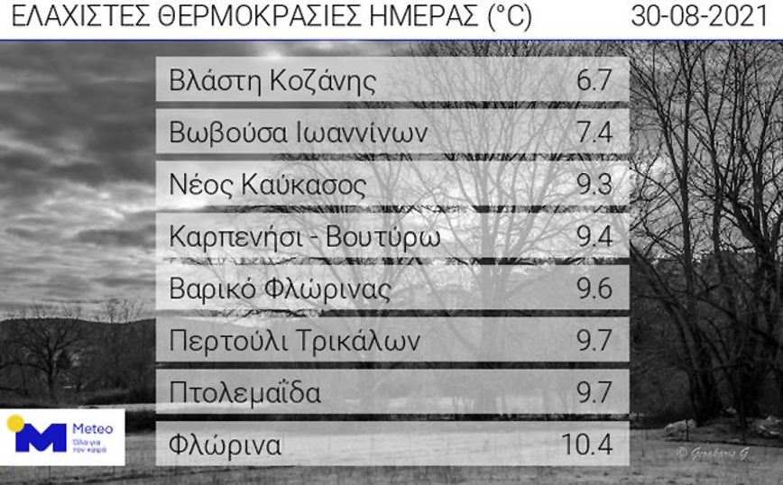 Στον πίνακα που ακολουθεί παρουσιάζονται οι 8 σταθμοί του δικτύου αυτόματων μετεωρολογικών σταθμών του Εθνικού Αστεροσκοπείου Αθηνών/meteo.gr που κατέγραψαν τις χαμηλότερες θερμοκρασίες το πρωί της Δευτέρας 30/08.