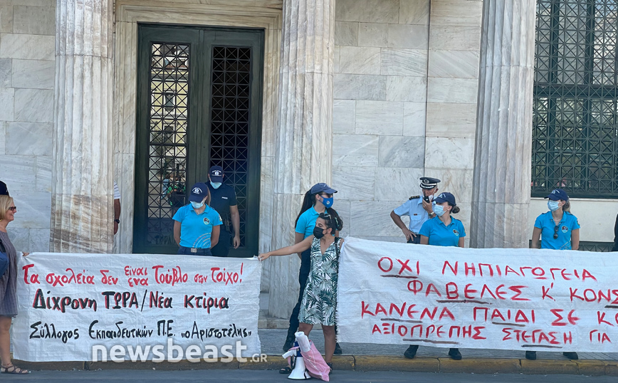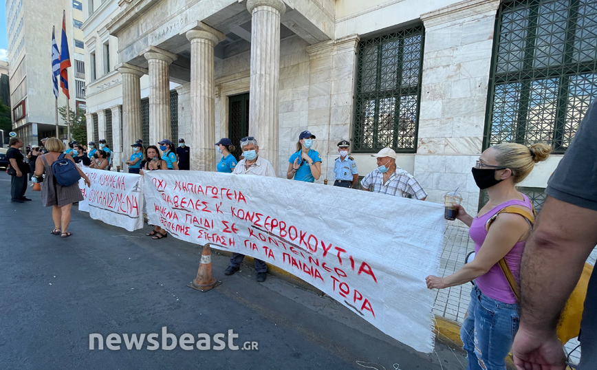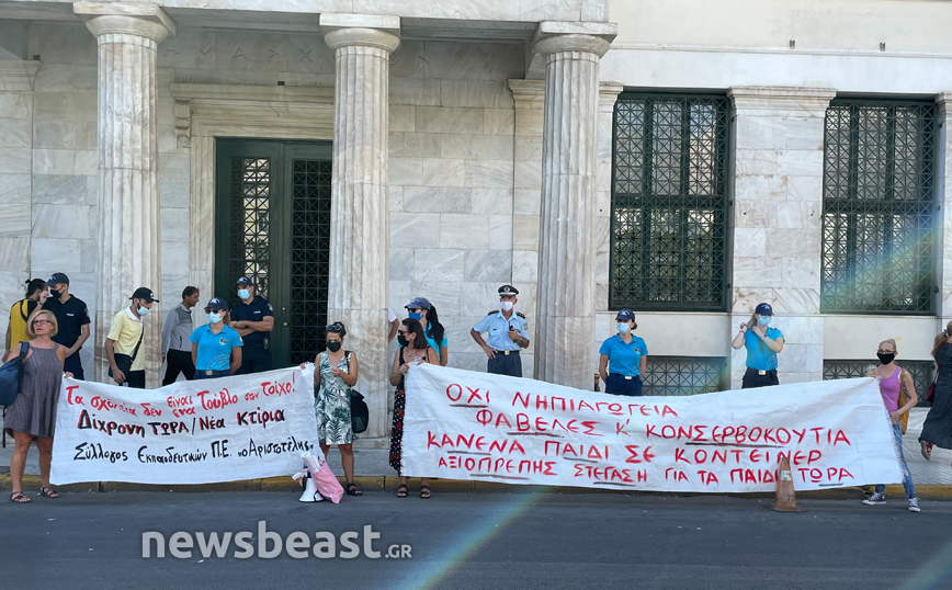 Οι συγκεντρωμένοι κρατούν πανό και ζητούν αξιοπρεπή στέγαση της προσχολικής αγωγής και ανοιχτούς πράσινους χώρους για τα παιδιά και τους ίδιους.