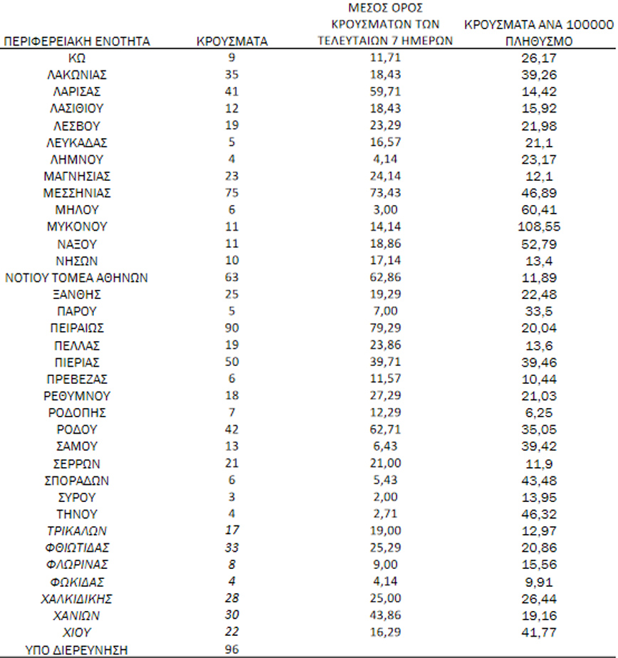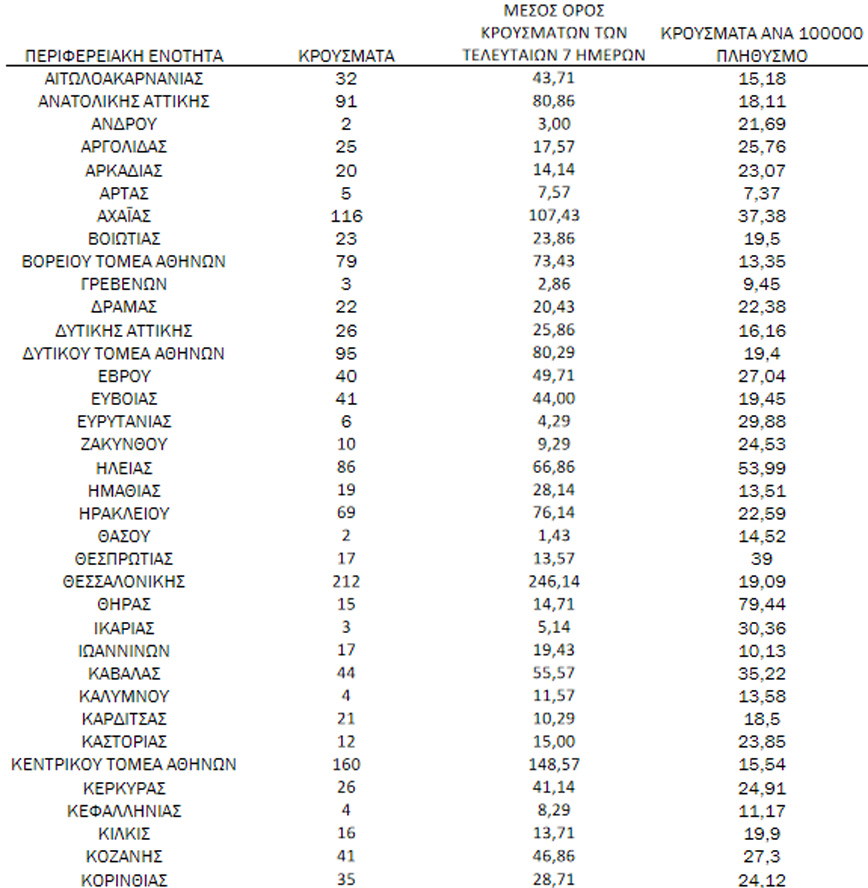 Συγκεκριμένα η Αττική έχει 614 νέα κρούσματα κορονοϊού, η Θεσσαλονίκη 212, ενώ στο «κόκκινο» βρίσκεται η Αχαΐα με 116.