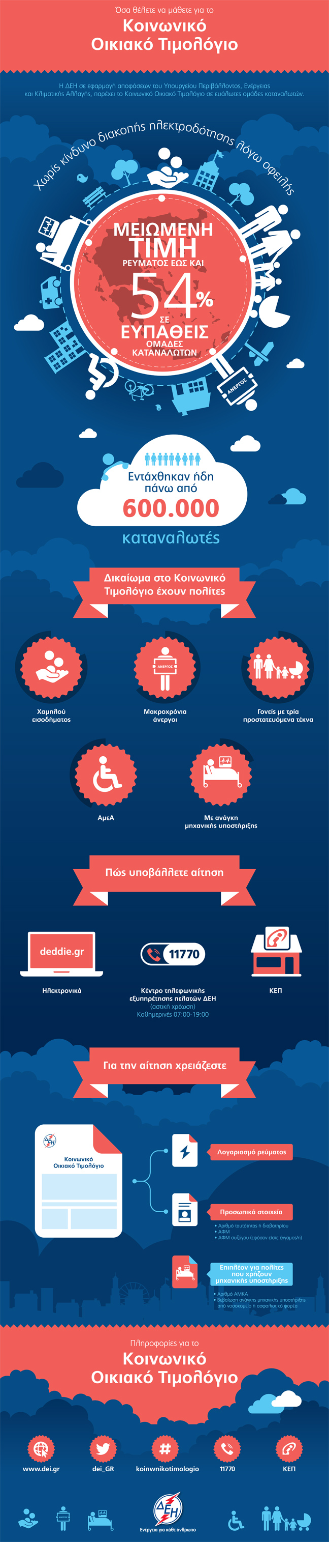 Η ΔΕΗ, εφαρμόζοντας την απόφαση του Υπουργείου Περιβάλλοντος, Ενέργειας και Κλιματικής Αλλαγής, παρέχει το Κοινωνικό Οικιακό Τιμολόγιο (ΚΟΤ) σε ευπαθείς ομάδες καταναλωτών με μειωμένη τιμή ρεύματος έως και 54% και αδιάκοπη ηλεκτροδότηση, στο οποίο έχουν ήδη ενταχθεί περισσότεροι από 600.000 πολίτες.