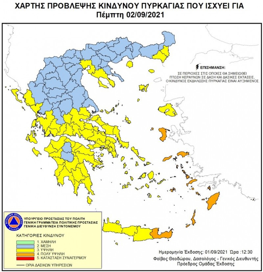 Σύμφωνα με το Χάρτη Πρόβλεψης Κινδύνου Πυρκαγιάς που εκδίδει η Γενική Γραμματεία Πολιτικής Προστασίας του Υπουργείου Προστασίας του Πολίτη (civilprotection.gr), για αύριο Πέμπτη 2 Σεπτεμβρίου 2021, προβλέπεται πολύ υψηλός κίνδυνος πυρκαγιάς (κατηγορία κινδύνου 4) για τις εξής περιοχές: