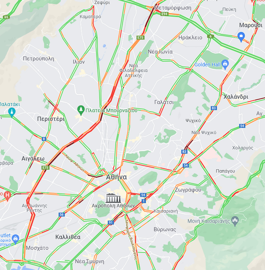 Στη λεωφόρο Κηφισίας προβλήματα παρατηρούνται από τη Φιλοθέη έως την Πανόρμου ενώ στη Μεσογείων από την Κατεχάκη μέχρι την Κηφισίας.