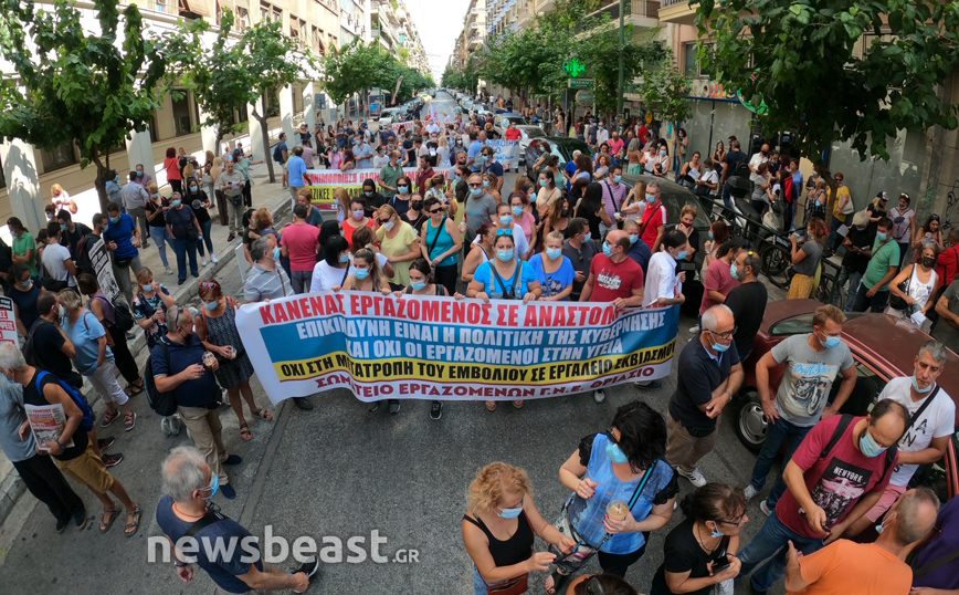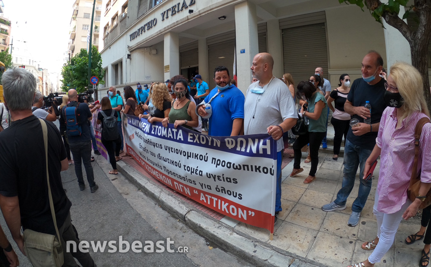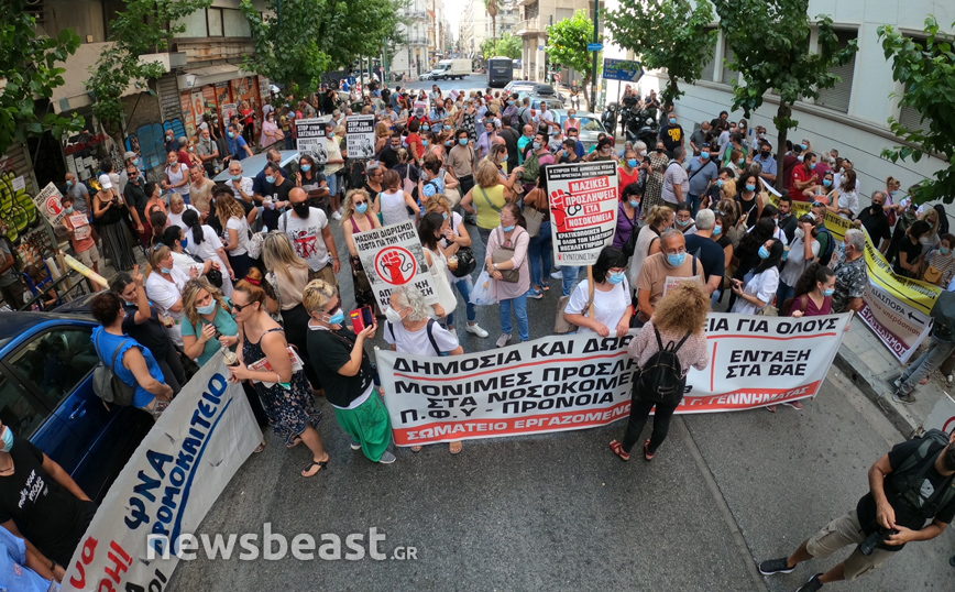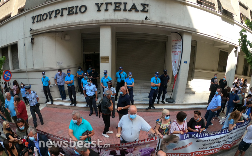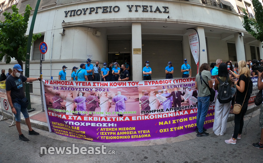 Συγκέντρωση διαμαρτυρίας πραγματοποιούν υγειονομικοί και συνδικαλιστικές οργανώσεις τους έξω από το υπουργείο Υγείας στο κέντρο της Αθήνας.