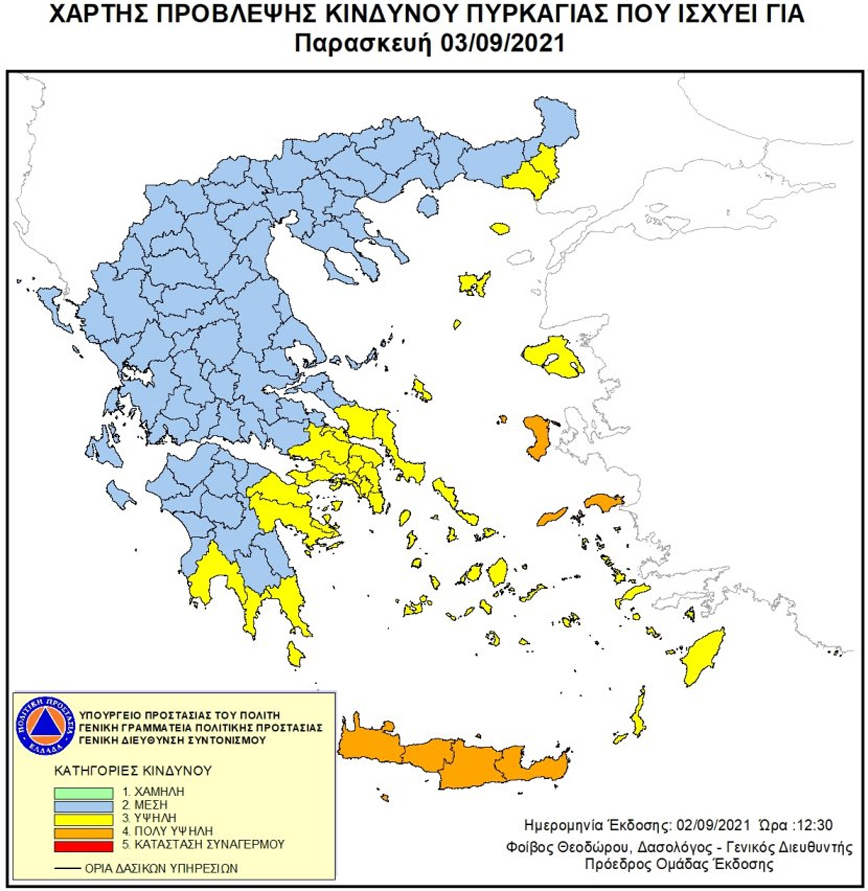 Σύμφωνα με το Χάρτη Πρόβλεψης Κινδύνου Πυρκαγιάς που εκδίδει η Γενική Γραμματεία Πολιτικής Προστασίας του Υπουργείου Προστασίας του Πολίτη (civilprotection.gr), για αύριο Παρασκευή 3 Σεπτεμβρίου 2021, προβλέπεται πολύ υψηλός κίνδυνος πυρκαγιάς (κατηγορία κινδύνου 4) για τις εξής περιοχές: