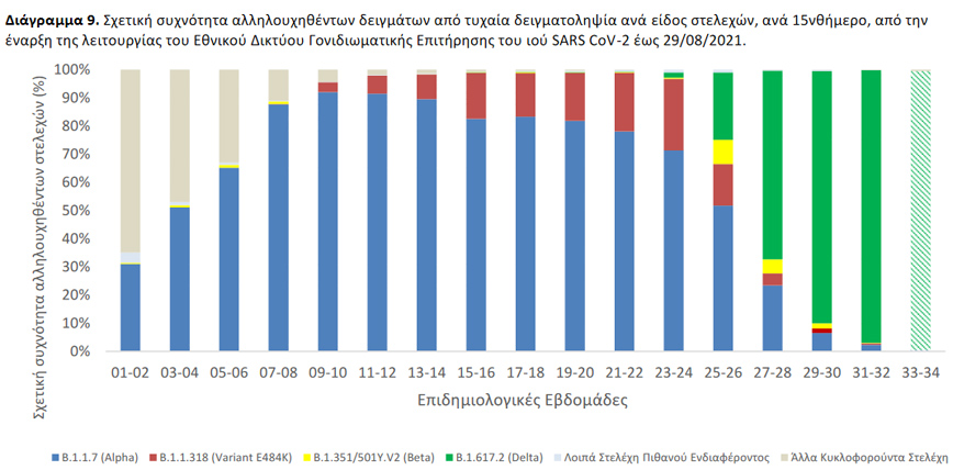 Η διαχρονική εξέλιξη της σχετικής συχνότητας των αλληλουχηθέντων δειγμάτων από τυχαία δειγματοληψία ανά είδος στελεχών, μέχρι και την εβδομάδα 32 απεικονίζεται στο Διάγραμμα 9, ενώ δίνονται επιπλέον προσωρινά στοιχεία για τις εβδομάδες 33-34.