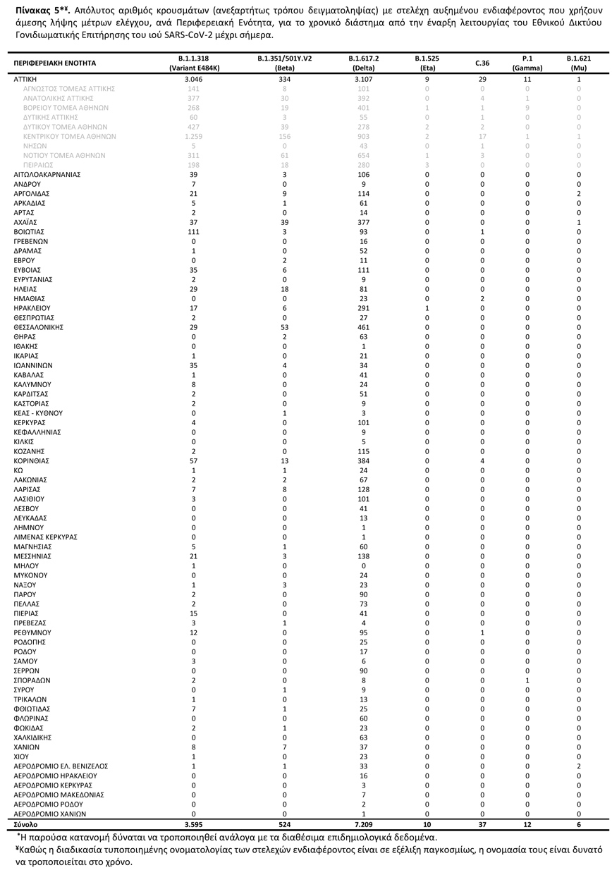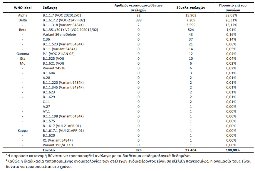 Από τα δείγματα αυτά, 43,44% αφορούν στο B.1.1.318 (Variant E484K), 28,48% στο Delta, 15,78% στο Alpha, 6,67% στο Beta, 0,13% στο C.36 και 0,10% στο Gamma.