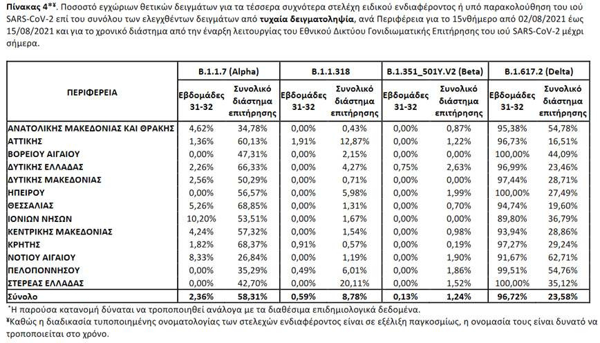 Μεταξύ των 26.651 τυχαία επιλεγμένων δειγμάτων στην επικράτεια, τα τέσσερα πιο συχνά στελέχη ειδικού ενδιαφέροντος ή υπό παρακολούθηση που έχουν απομονωθεί είναι το Alpha, με ποσοστό 58,31%, ακολουθούμενο από το Delta με ποσοστό 23,58%, το B.1.1.318 (Variant E484K) με ποσοστό 8,78%, και το Beta με ποσοστό 1,24% (Πίνακας 4).