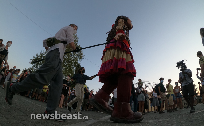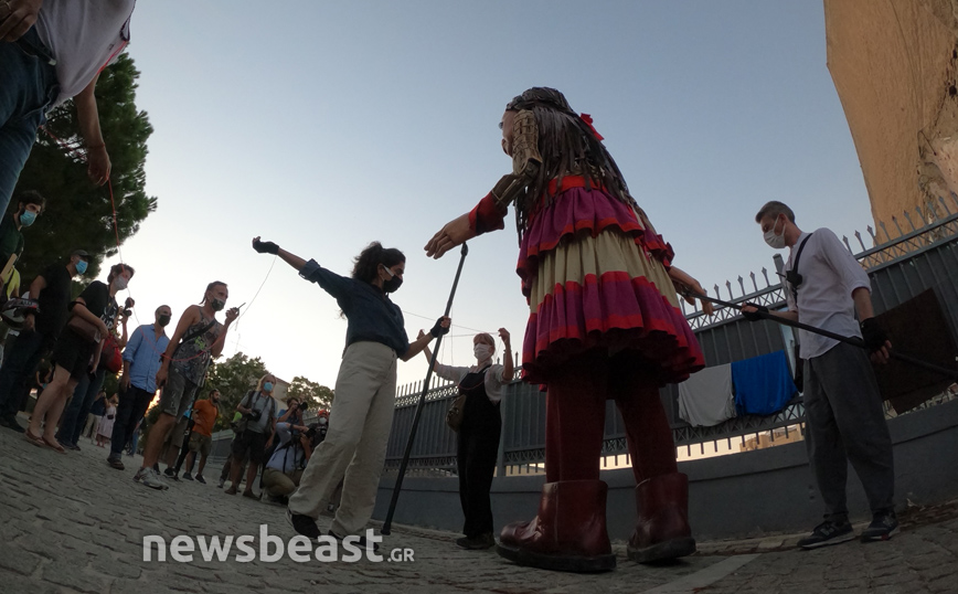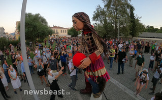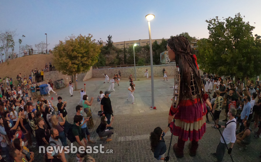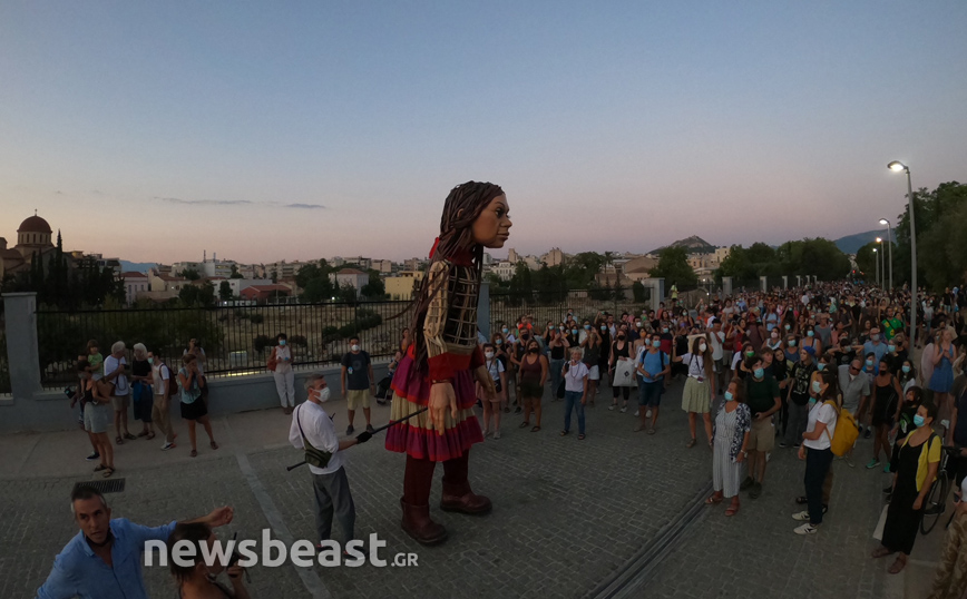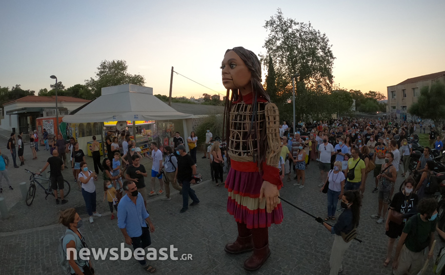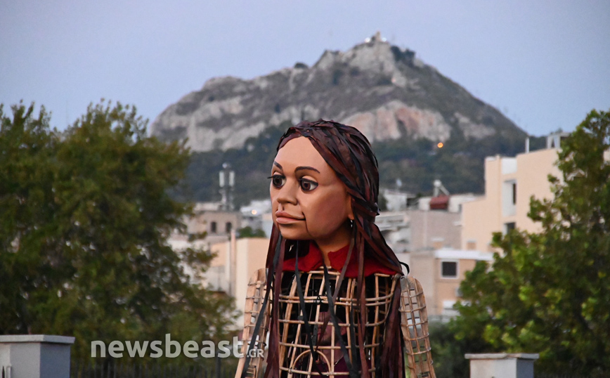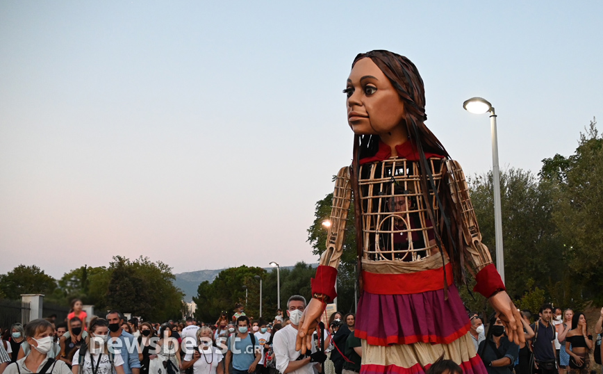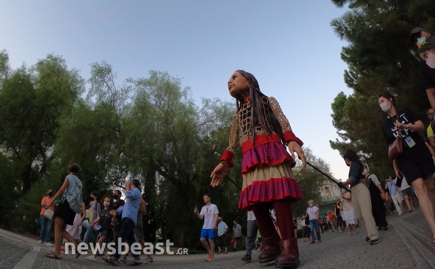 Η 9χρονη Αμάλ, η μαριονέτα ύψους 3,5 μέτρων που απεικονίζει μια προσφυγοπούλα από τη Συρία, έφτασε και στην Αθήνα, αφού περιπλανήθηκε σε περιοχές της Ελλάδας, όπως τη Χίο, τα Γιάννενα, τα Τρίκαλα και τη Λάρισα.