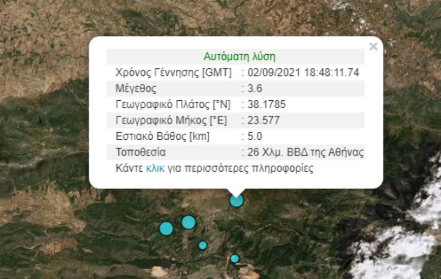 Ασθενής σεισμός μεγέθους 3,6 Ρίχτερ σημειώθηκε στις 21:48 της Πέμπτης (2/9) στην Αθήνα.