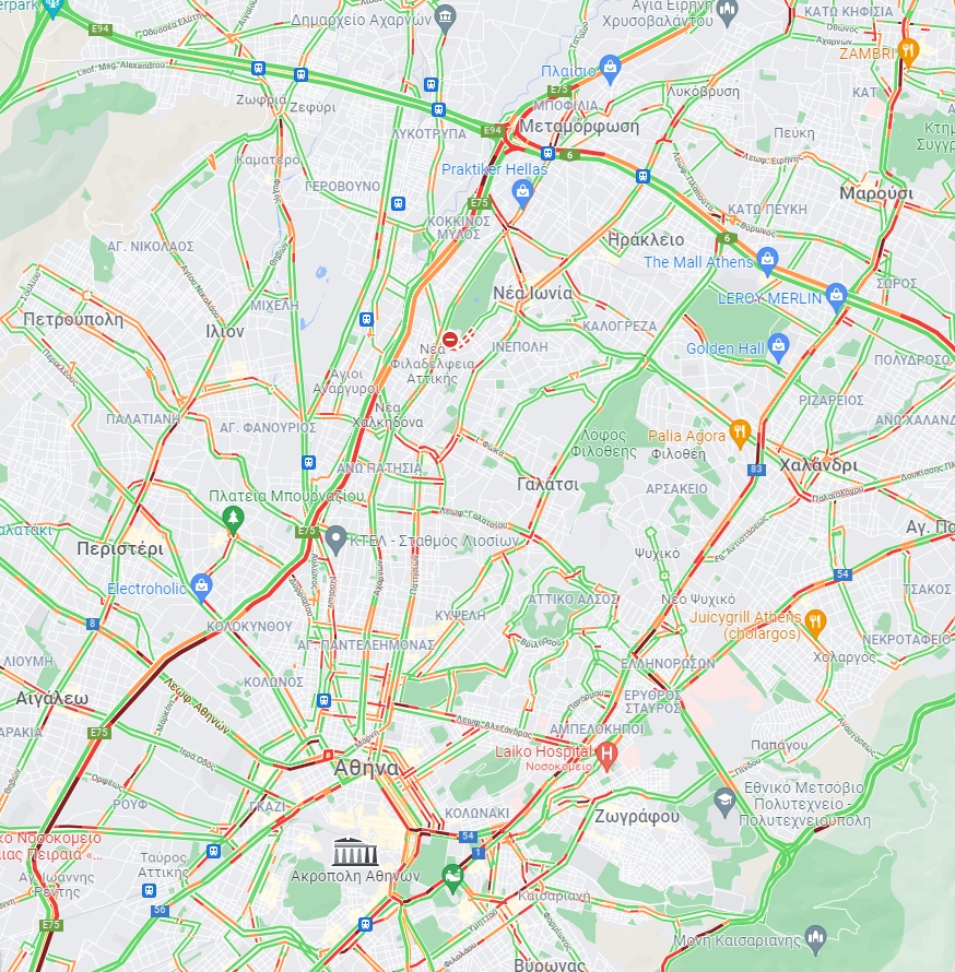 Έντονη είναι κάθε Παρασκευή η κίνηση στην πρωτεύουσα και αυτή την ώρα σύμφωνα με την ενημέρωση της τροχαίας και τον online χάρτη της Google οι οδηγοί θα χρειαστούν μεγάλη υπομονή σε Κηφισό, Βασ. Σοφίας στην κάθοδο, Βασ. Κωνσταντίνου και Κατεχάκη στο ρεύμα προς Ηλιούπολη.