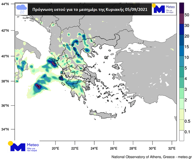 Σύμφωνα με τα τελευταία προγνωστικά δεδομένα του Εθνικού Αστεροσκοπείου Αθηνών/meteo.gr, , τοπικές βροχές και καταιγίδες αναμένονται από τις πρώτες ώρες της Κυριακής στο Ιόνιο και στα ορεινά της Κεντροδυτικής Μακεδονίας, της Ηπείρου, της Θεσσαλίας και της Πελοποννήσου. Τα φαινόμενα έως το μεσημέρι θα επεκταθούν στα υπόλοιπα ηπειρωτικά πλην της Θράκης και θα ενισχυθούν, ενώ υπάρχει και πιθανότητα εκδήλωσης χαλαζοπτώσεων.