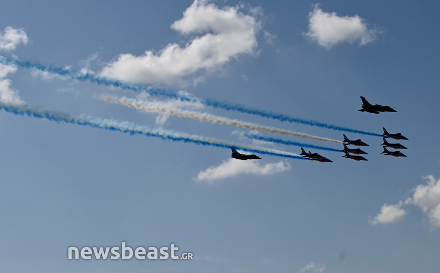 Έναν ξεχωριστό τρόπο για να πουν «αντίο» στη χώρα μας επέλεξαν οι πιλότοι των δύο γαλλικών μαχητικών αεροσκαφών Rafale και του ακροβατικού σμήνους «Patrouille de France», που συμμετείχαν στην Athens Flying Week στις 4 και 5 Σεπτεμβρίου στην 114 Πτέρυγα Μάχης στην αεροπορική βάση της Τανάγρας.