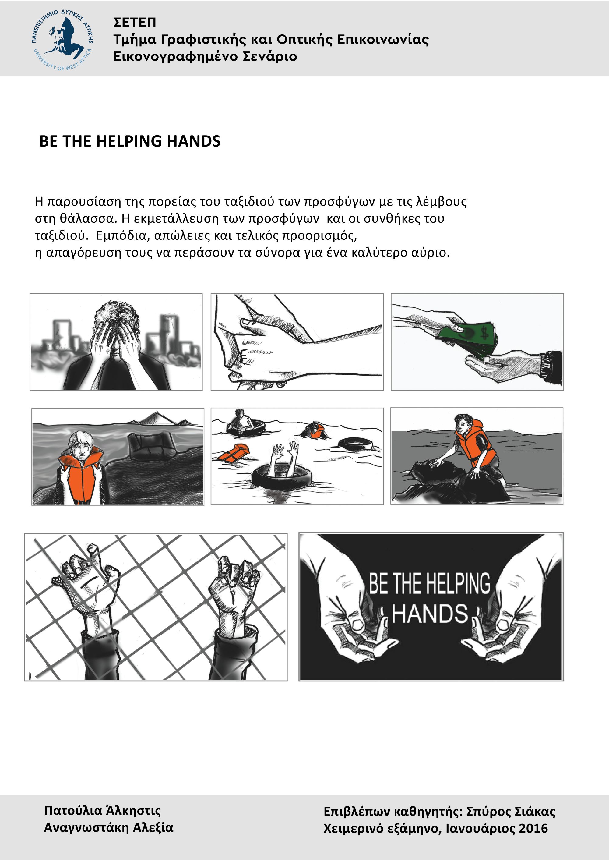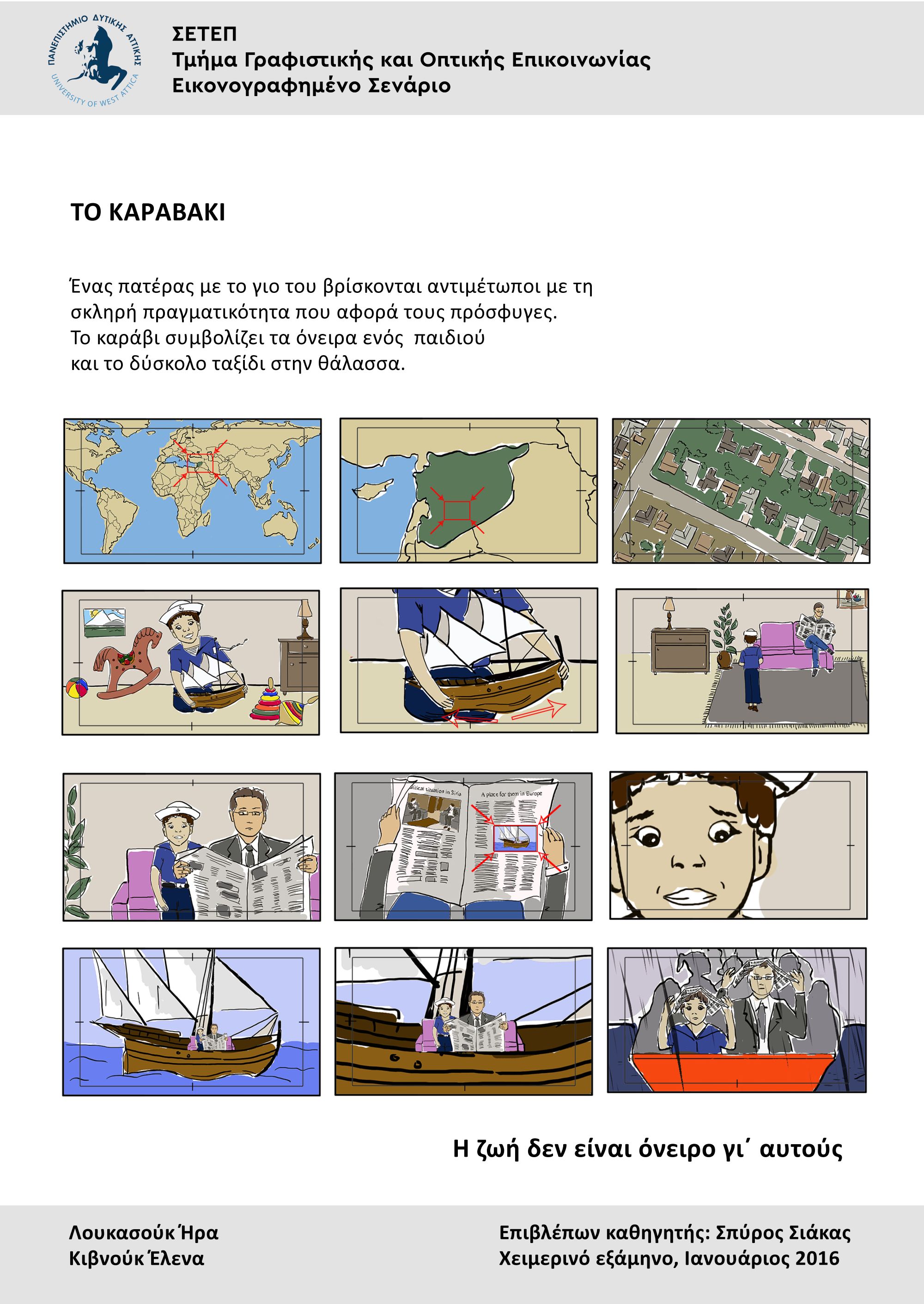 Φοιτητές και φοιτήτριες του Τμήματος Γραφιστικής και Οπτικής Επικοινωνίας της Σχολής Εφαρμοσμένων Τεχνών και Πολιτισμού του Πανεπιστημίου Δυτικής Αττικής αποδίδουν με το δικό τους τρόπο – μέσα από εικονογραφημένα σενάρια και ταινίες – την οδύσσεια των πληθυσμών που τα τελευταία χρόνια υποχρεώθηκαν βίαια να εγκαταλείψουν τις εστίες τους. Οι φοιτητές, στα τέσσερα τελευταία εξάμηνα των σπουδών τους διδάσκονται τα εικονογραφημένα σενάρια (storyboards) και πώς να αφηγούνται μια ιστορία μέσω του animation. Στο πλαίσιο αυτό κλήθηκαν να δημιουργήσουν σενάρια και ταινίες για το προσφυγικό, έχοντας ως πηγή έμπνευσής τους συχνά τα ρεπορτάζ μέσων ενημέρωσης το 2015, αλλά και τις αφηγήσεις εκπροσώπων ανθρωπιστικών οργανώσεων.