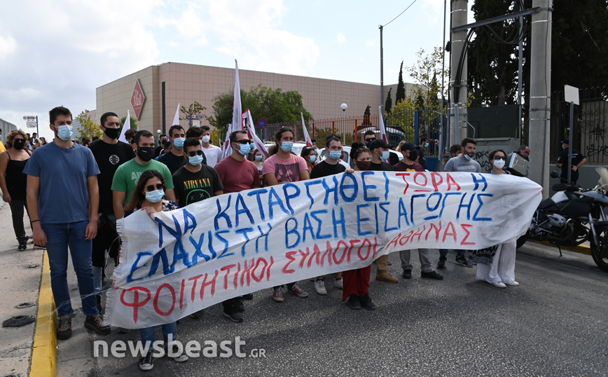 «Κατάργηση της Ελάχιστης Βάσης Εισαγωγής εδώ και τώρα», αναγράφεται σε ένα πανό.