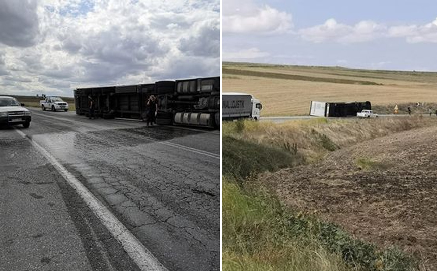 Χαρακτηριστικές είναι οι εικόνες που δημοσιεύει το larissanet.gr, στις οποίες φαίνεται, μετά την ανατροπή της νταλίκας, το οδόστρωμα έχει καλυφθεί από καύσιμα και λάδια.