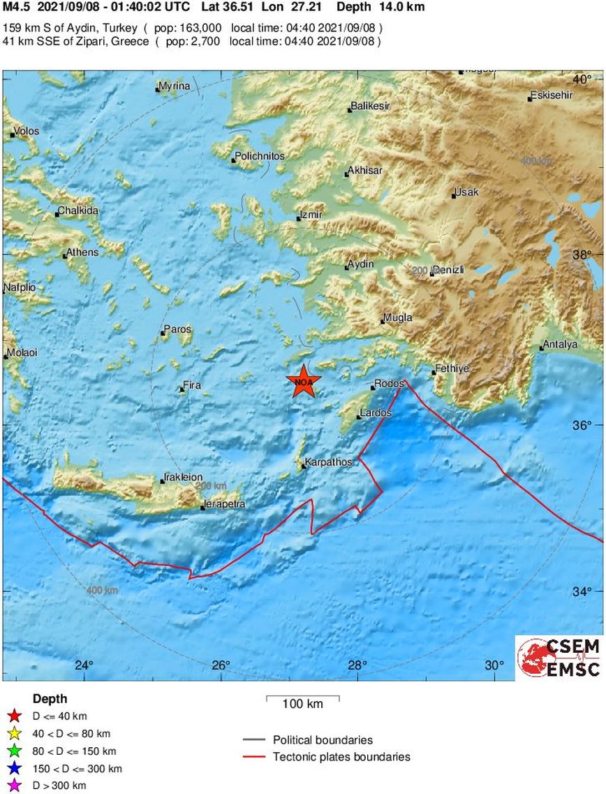 Σεισμική δόνηση μεγέθους 4,5 βαθμών της κλίμακας Ρίχτερ σημειώθηκε πριν από λίγα λεπτά στην περιοχή νοτιανατολικά της Κω, ανοιχτά της Νισύρου, και συγκεκριμένα 32 χιλιόμετρα από την περιοχή Κέφαλος. Ο σεισμός ήταν επιφανειακός.