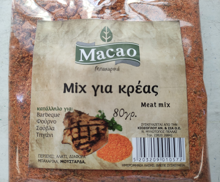 Συγκεκριμένα, ο Οργανισμός, και ειδικότερα η Περιφερειακή Διεύθυνση Κεντρικής Μακεδονίας του φορέα, προέβη σε δειγματοληψία τροφίμου με στοιχεία: «ΜΙΓΜΑ ΜΠΑΧΑΡΙΚΩΝ» με την επωνυμία MACAO MIX ΓΙΑ ΚΡΕΑΣ, με ημερομηνία ανάλωσης κατά προτίμηση 12/2024 και αριθμό παρτίδας LOT 2005, προέλευσης Ε.Ε., σε διαφανή περιέκτη των 80 γρ. που συσκευάζεται και διανέμεται στην Ελλάδα από την ΚΙΟΣΟΓΛΟΥ ΑΝ. & ΣΙΑ ΟΕ – «MACAO» με έδρα τον Νέο Μυλότοπο Π.Ε. Πέλλας.
