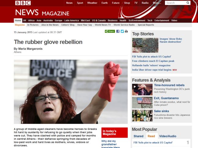 Εκτενές ρεπορτάζ για τον αγώνα των απολυμένων καθαριστριών του υπουργείου Οικονομικών φιλοξενεί το βρετανικό BBC, κάνοντας λόγο για την «επανάσταση του πλαστικού γαντιού».