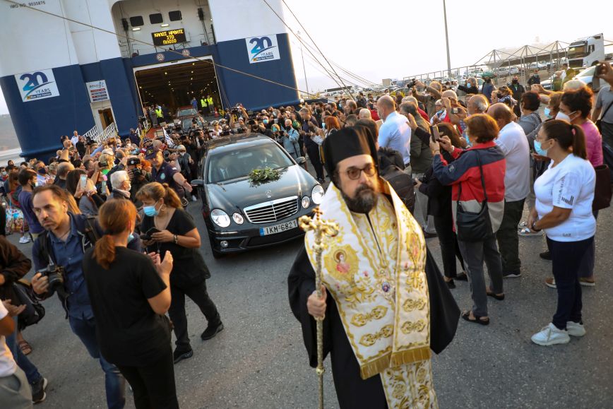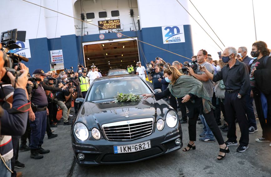 Στο λιμάνι έχει μαζευτεί πλήθος κόσμου που υποδέχτηκε το μεγάλο μουσικοσυνθέτη εν μέσω χειροκροτημάτων, λίγες ώρες πριν οδηγηθεί στην τελευταία του κατοικία, δίπλα στον πατέρα και τον αδερφό του. Στο λιμάνι βρίσκεται ήδη ο γγ του ΚΚΕ, Δημήτρης Κουτσούμπας.