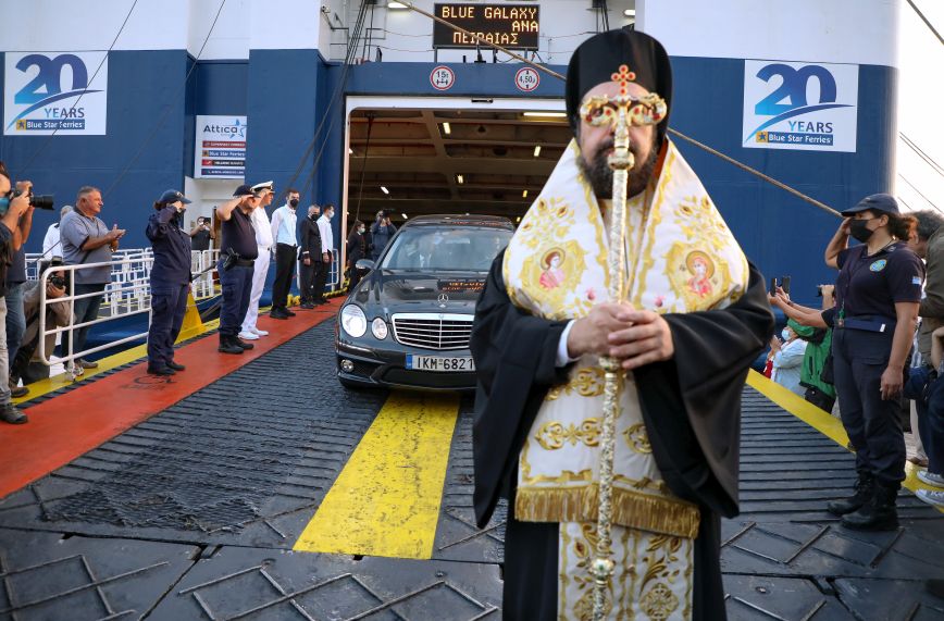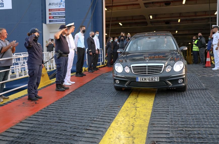 Αφού ανέτειλε ο ήλιος βγήκε από το πλοίο στο λιμάνι των Χανίων η νεκροφόρα που μεταφέρει τη σορό του Μίκη Θεοδωράκη.