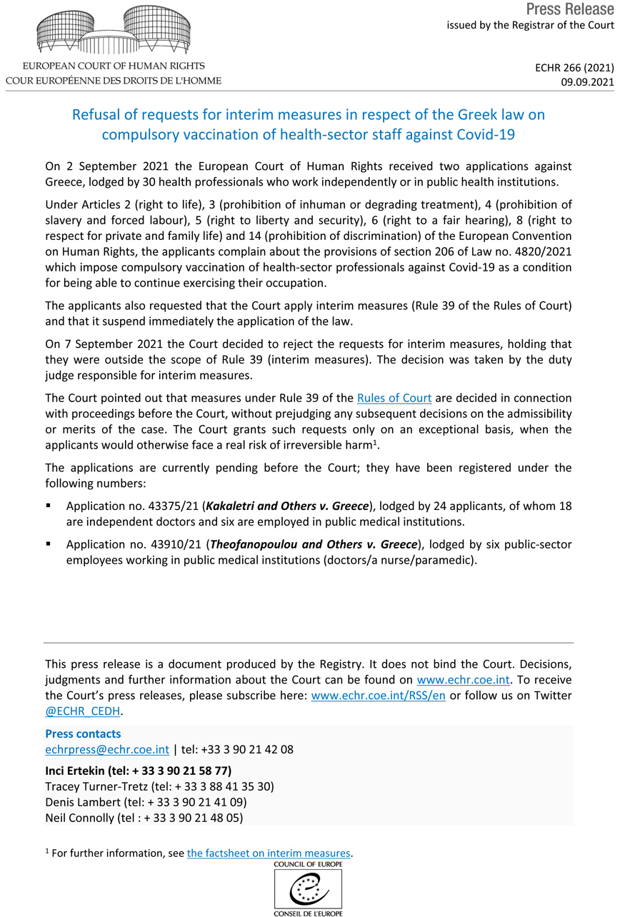 Συγκεκριμένα, όπως αναφέρει σε ανακοίνωσή του, στις 2 Σεπτεμβρίου έλαβε δύο αιτήματα κατά της Ελλάδας από 30 επαγγελματίες υγείας που εργάζονται ανεξάρτητα ή σε δημόσια ιδρύματα υγείας. Οι αιτούντες διαμαρτύρονται για την επιβολή του υποχρεωτικού εμβολιασμού επαγγελματιών του τομέα υγείας κατά του κορονοϊού ως προϋπόθεση για να συνεχίσουν να ασκούν το επάγγελμά τους.