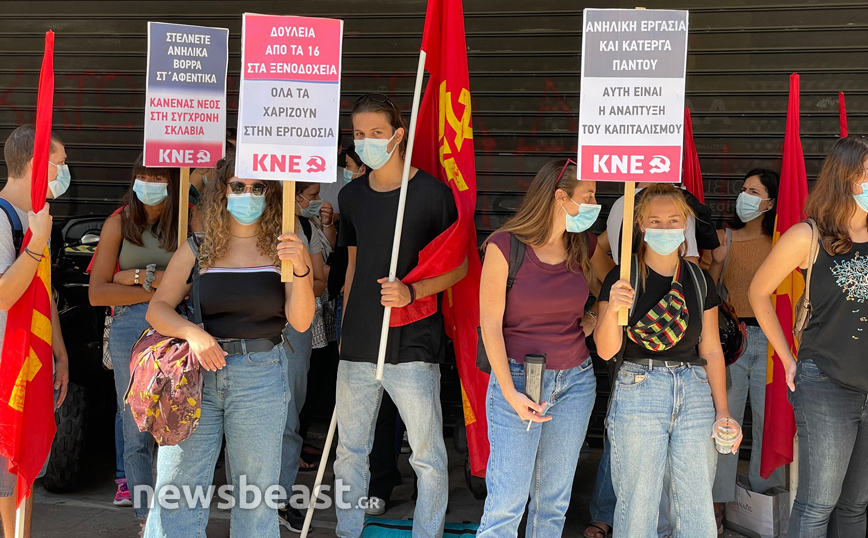 Τα μέλη της Κομμουνιστικής Νεολαίας Ελλάδας που συμμετέχουν στην κινητοποίηση κρατούν πανό και πλακάτ με συνθήματα όπως «ανήλικη εργασία και κάτεργα παντού, αυτή είναι η ανάπτυξη του Καπιταλισμού».