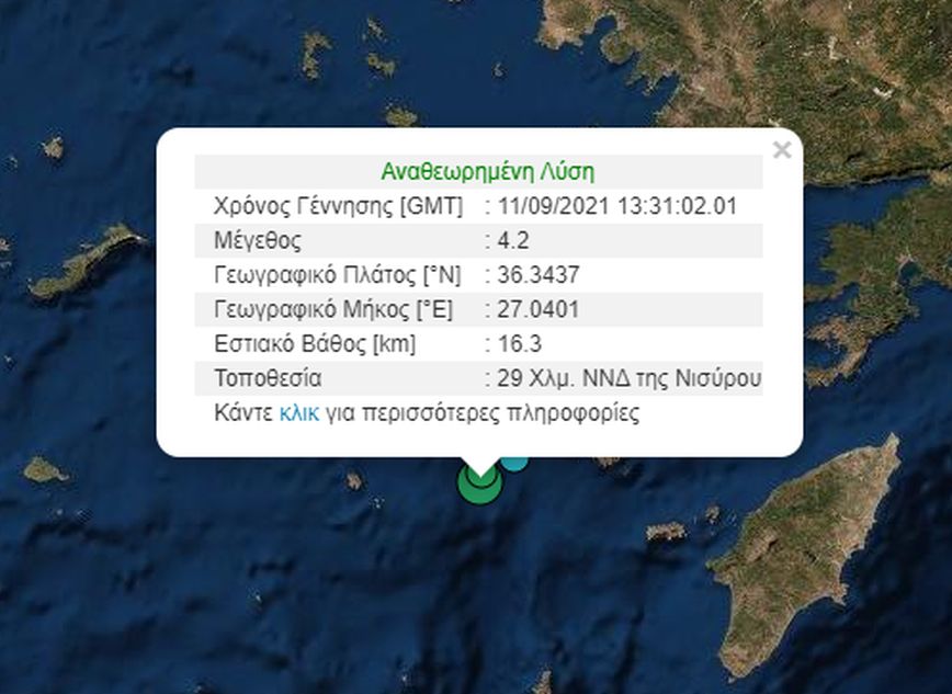 Σεισμική δόνηση μεγέθους 4,2 βαθμών της κλίμακας Ρίχτερ σημειώθηκε σε απόσταση 29 χλμ. νότια-νοτιοδυτικά της Νισύρου.