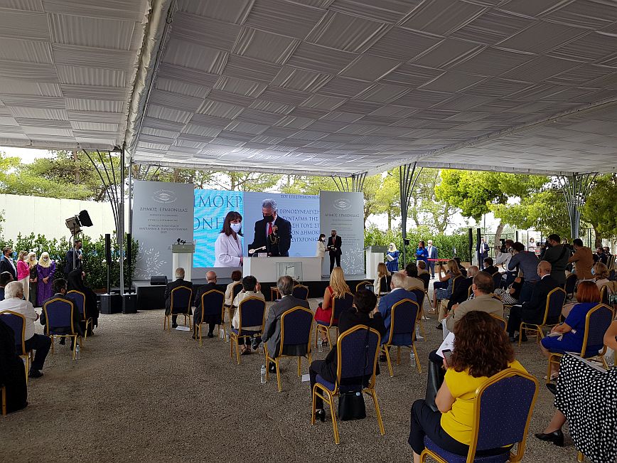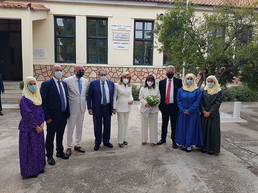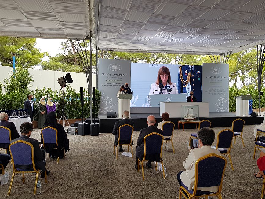 Η Πρόεδρος της Δημοκρατίας στην αντιφώνησή της αναφέρθηκε αναλυτικά στη μακρόχρονη ιστορίας της Ερμιόνης από την αρχαιότητα μέχρι τις μέρες μας, κάνοντας λόγο για «έναν ευλογημένο τόπο, όπου η ιστορία συναντά την ομορφιά της φύσης και η σύγχρονη ζωντάνια ένα σπάνιο βάθος πολιτισμού, εγγεγραμμένο στα ορατά ίχνη των μνημείων της, στην ιδιαίτερη αρχιτεκτονική της, στην καλαισθησία των κατοίκων της». Πρόσθεσε δε πως τη γεμίζει αισιοδοξία η απόφαση της δημοτικής αρχής να αξιοποιηθούν τα πλούσια αρχαιολογικά αποθέματα της Ερμιόνης, αναπλάθοντας ιστορικά τοπόσημα της πόλης, όπως το ρωμαϊκό ταφικό μνημείο, αναδεικνύοντας τα αρχαιολογικά ευρήματα της παλαιοχριστιανικής βασιλικής του 4ου αιώνα και τα εμφανή τμήματα των ρωμαϊκών τειχών, αλλά κυρίως δημιουργώντας ένα Αρχαιολογικό Μουσείο. Εν συνεχεία η κ. Σακελλαροπούλου παρέστη στην εναρκτήρια παρουσίαση του Επιστημονικού Συνεδρίου «Η Εθνοσυνέλευση Ερμιόνης, το Σύνταγμα της Τροιζήνας και η επίδρασή τους στην Επανάσταση και στον δημοκρατικό βίο της σύγχρονης Ελλάδας».