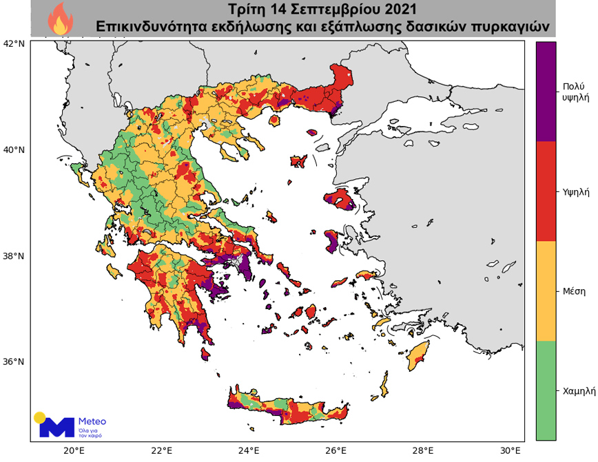 Με βάση τον Καναδικό πυρομετεωρολογικό δείκτη που υπολογίζει επιχειρησιακά το Εθνικό Αστεροσκοπείο Αθηνών/meteo.gr, πολύ υψηλή επικινδυνότητα αναμένεται σήμερα σε μεγάλο μέρος της Αττικής, και τοπικά σε τμήματα της Ανατολικής Πελοποννήσου, της Θράκης, της Νότιας Κρήτης, των Κυκλάδων, της Λέσβου και της Χίου.