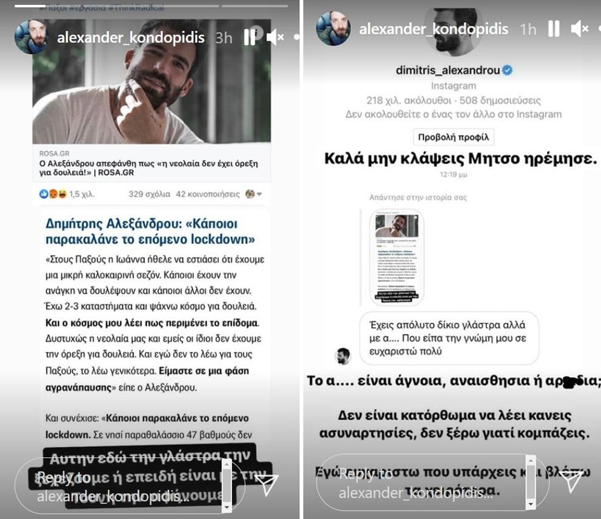 Ένας από αυτούς που σχολίασαν τις δηλώσεις ήταν και ο Αλέξανδρος Κοντοπίδης, ο οποίος ανέβασε στα stories του Instagram ένα δημοσίευμα με τις δηλώσεις του Δημήτρη Αλεξάνδρου, χαρακτηρίζοντάς τον «γλάστρα». «Αυτήν εδώ τη γλάστρα την ξε@@@@@ε ή επειδή είναι με την Τούνη την αφήνουμε;» έγραψε χαρακτηριστικά ο YouTuber.