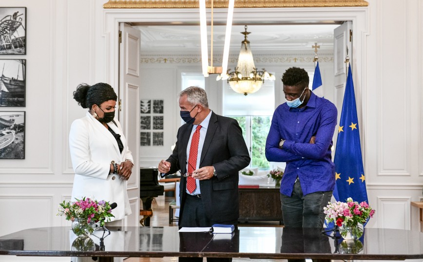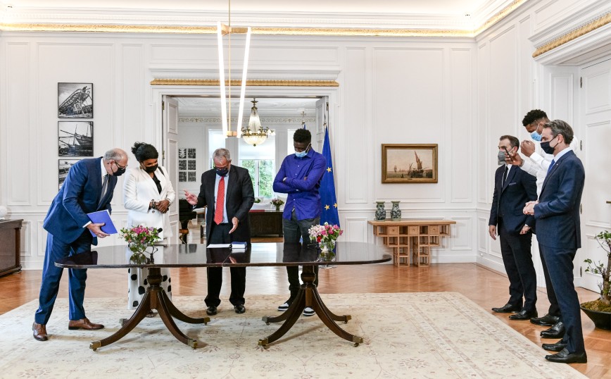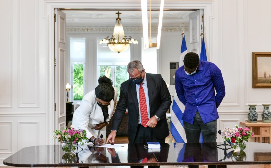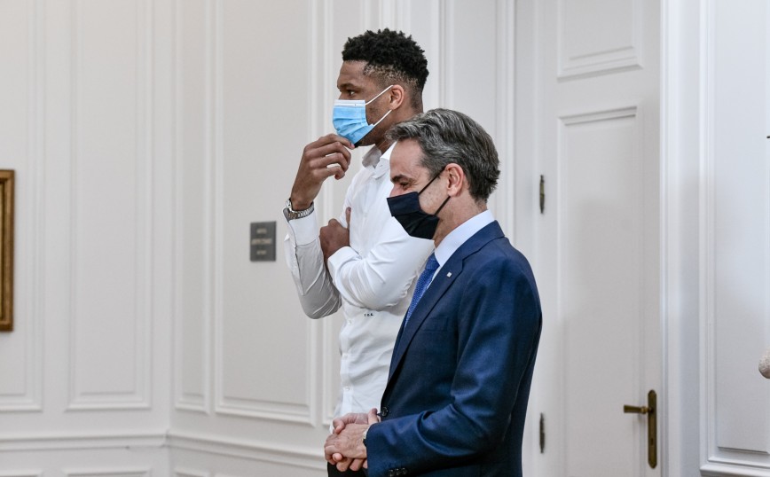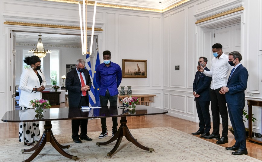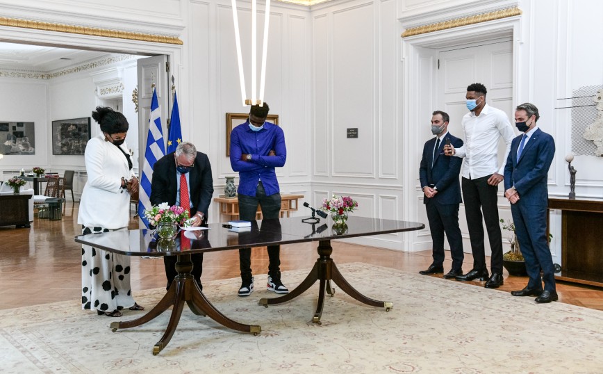 Ο Γιάννης Αντετοκούνμπο, ο οποίος στεκόταν δίπλα στον πρωθυπουργό Κυριάκο Μητσοτάκη, τραβούσε βίντεο με το κινητό του τηλέφωνο τις στιγμές που η μητέρα και ο αδερφός του υπέγραφαν τα σχετικά έγγραφα της πολιτογράφησής τους σε τελετή στο Μέγαρο Μαξίμου.